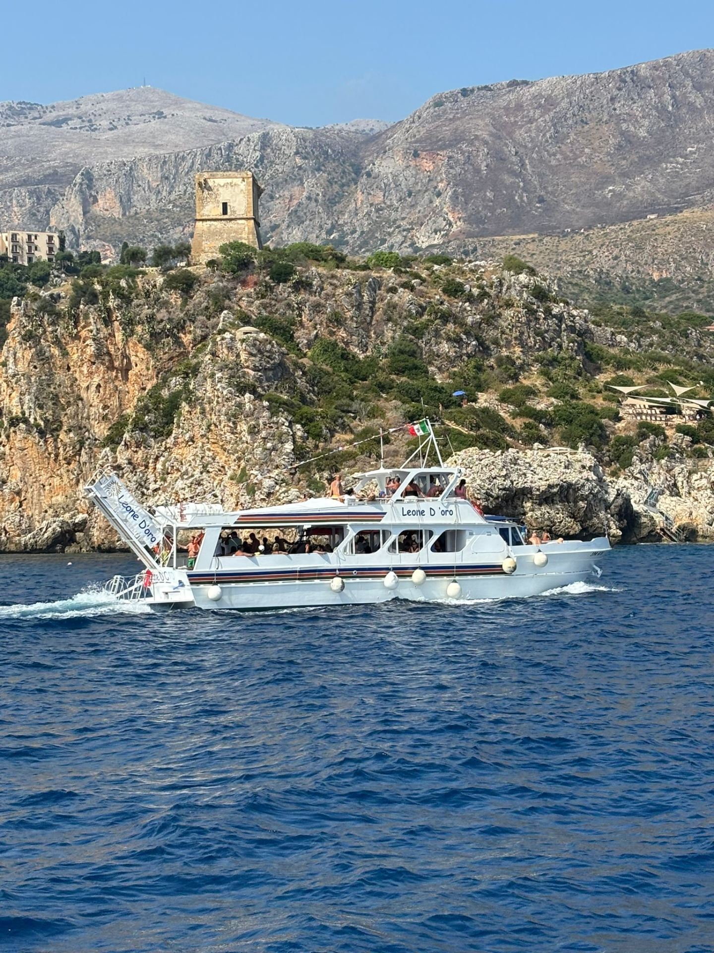 The Leone D'Oro motor vessel, departing from the new port of Castellammare del Golfo, can accommodate up to 110 passengers. A typical Trapani snack will be served during the trip. Swimming stops are available along the way, thanks to convenient access to the sea from the stern platform.